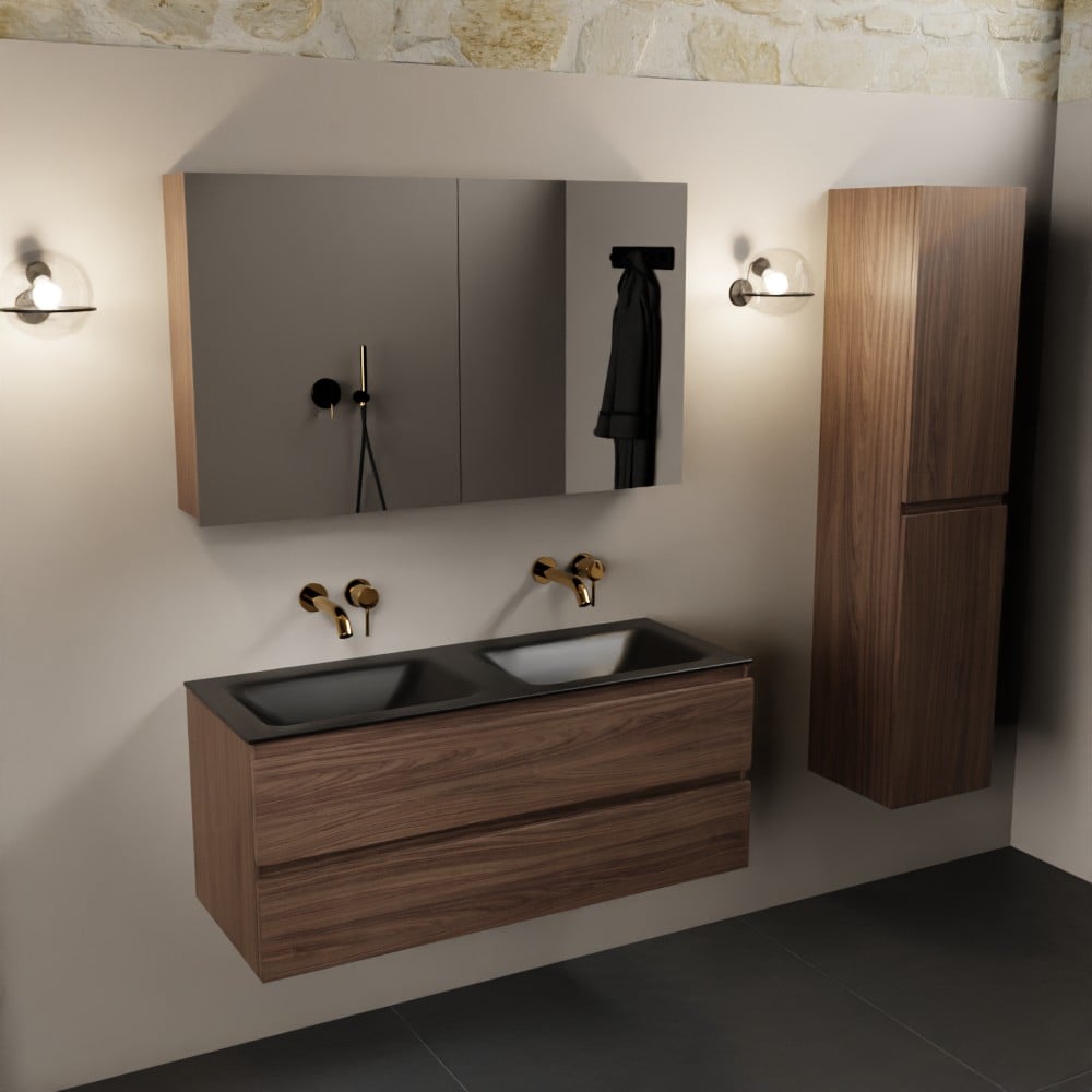 MONDIAZ AIVY 120cm badmeubel Mocha, wastafel Urban solid surface dubbel zonder kraangat met spiegelkast