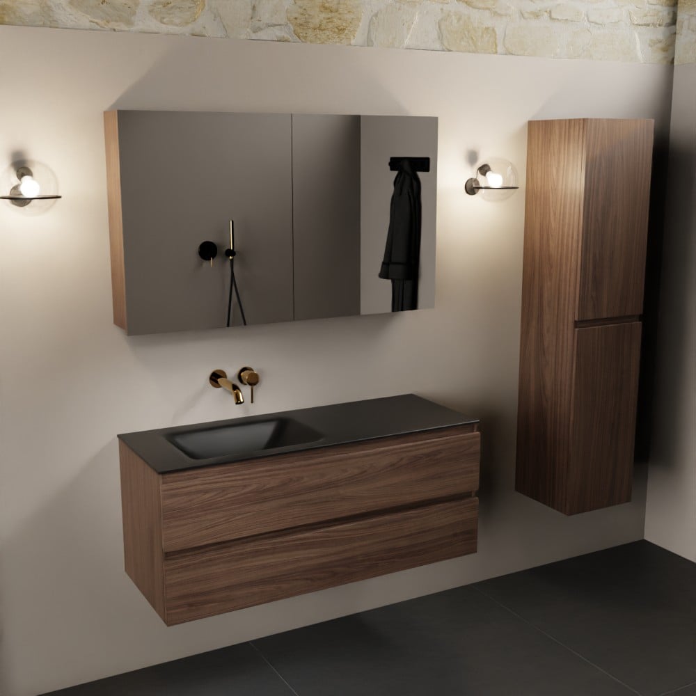 MONDIAZ AIVY 120cm badmeubel Mocha, wastafel Urban solid surface links zonder kraangat met spiegelkast